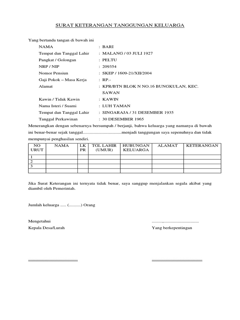 Surat keterangan penghasilan dan tanggungan keluarga mp3 & mp4. Kami berasumsi bahwa hak tanggungan sertifikat hak tanggungan inilah yang mempunyai kekuatan eksekutorial yang sama dengan putusan pengadilan yang telah memperoleh kekuatan. Contextual translation of tanggungan keluarga into english. Sebagai wajib pajak orang pribadi, anda harus mengetahui siapa saja tanggungan yang dapat diperhitungkan dalam ptkp 2019. Meniadi tanggungan saya penuh dan tidak mempunyai penghasilan sendiri.