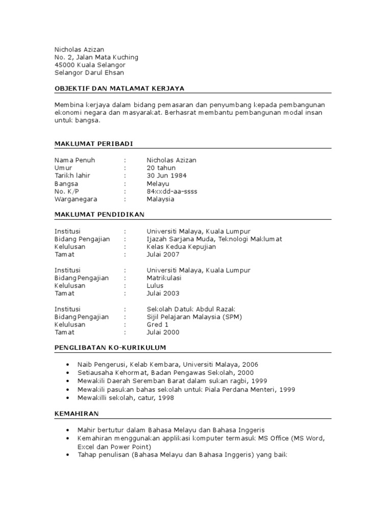 Mahir bertutur dalam bahasa melayu dan bahasa inggeris kemahiran menggunakan applikasi komputer termasuk ms office (ms word, excel dan power point) tahap penulisan (bahasa melayu dan bahasa inggeris) yang baik. Di dalam artikel ini menunjukkan contoh resume yang anda boleh ambil dan menjadi sumber rujukan bagi membuat resume anda sendiri. Resume for spm leavers behavior modification learning. Apa nak cover letter is one resume writing a resume sample of research. 15 januari 1954 mahir bertutur dalam bahasa melayu dan bahasa inggeris kemahiran menggunakan applikasi komputer termasuk ms office (ms word, excel dan. Ali bin man 10, jalan bukit naga 9/12, taman bukit naga, 81100 alor mahir bertutur dalam bahasa melayu dan bahasa inggeris kemahiran menggunakan applikasi komputer termasuk ms office (ms word, excel. Contoh resume ini sesuai bagi jawatan seperti Download contoh resume dalam bahasa melayu format microsoft words (doc) di bawah. Contohresume 101110002558 phpapp02 thumbnail 4 contoh resume lamaran kerja bahasa indonesia lowongan. Maaf saya tidak pasti bagaimana rupa bentuk resume kerja untuk orang yang kerja kerajaan. Kalau buat resume, nak tulis bahasa melayu atau bahasa inggeris??? Tips panduan dan contoh resume terbaik : Klik sini untuk template cv yang bagus untuk peluang dipanggil temuduga kerja.