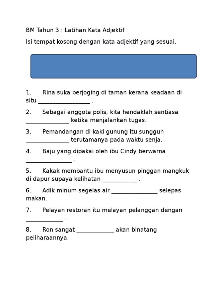 1.daging itu dihiris (tebal, nipis) agar cepat empuk. Mengenalpasti tiga jenis kata ganda yang dipelajari. Latihan tatabahasa kata pemeri sumber pendidikan. Terdapat 9 jenis kata adjektif iaitu: Latihan kata adjektif 1 1.